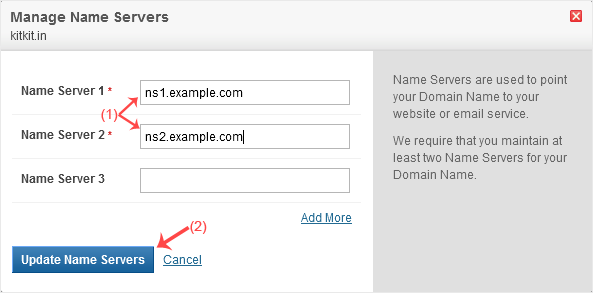 5. Enter the nameservers found in our Welcome Email and click on Update Name Servers.