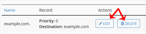 5. Locate the CNAME Record you want to edit or remove. Should you wish to edit a CNAME record, click on Edit. Modify the details, and click on Save Record. Removing a record can be done with Delete option.